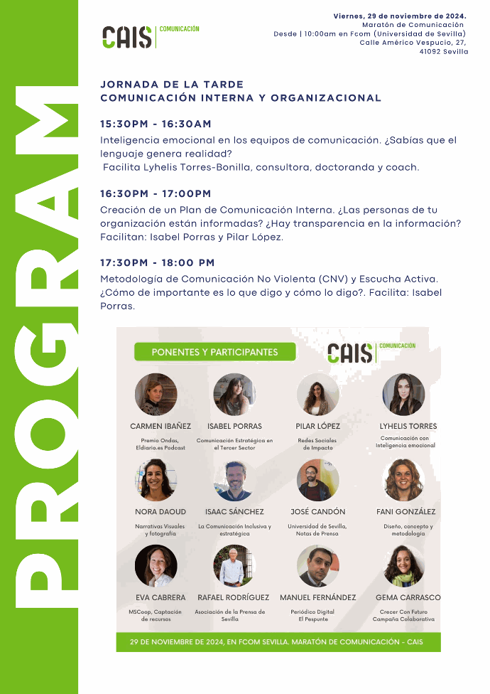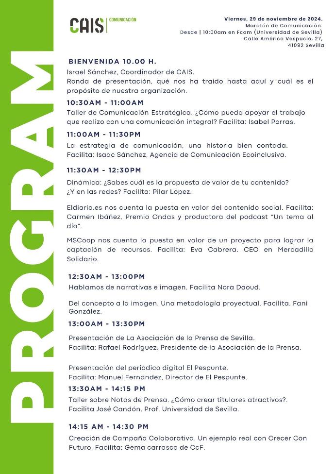 ¡Te esperamos el día 29 de Noviembre de 2024, desde las 10.00 am hasta las 18.00 pm, para nuestra Maratón de Comunicación! Jornada formativa, de reciclaje profesional, para ponernos cara aquellas personas que trabajamos el contenido social del Tercer Sector!