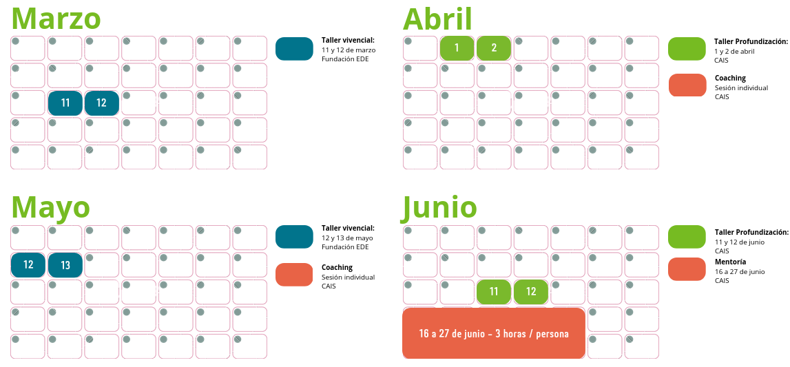 Entre cada taller se realizarán sesiones de coaching personal de 1,5 horas de duración cada una, en formato presencial y/o online. Estas sesiones ayudan al alumnado a identificar retos y bloqueos y proponer acciones concretas.